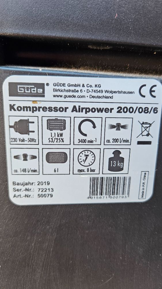 Predám málo používaný kompresor GUDE Airpower 200/08/06, objem nádrže 6l, prietok 200 l/min, tlak max 8 bar s príslušenstvom. Osobný odber.