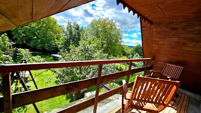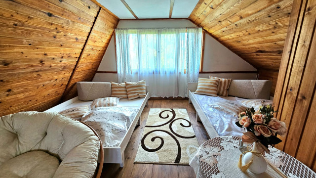 Celé vrchné poschodie chaty tvorí jedna, pomerne priestranná miestnosť s východom na balkón. Táto miestnosť je určené na spanie, a za denného svetla je krásne presvetlená a vhodná na denné aktivity. Zároveň sú tu krásne výhľady na zeleň a okolitú prírodu.