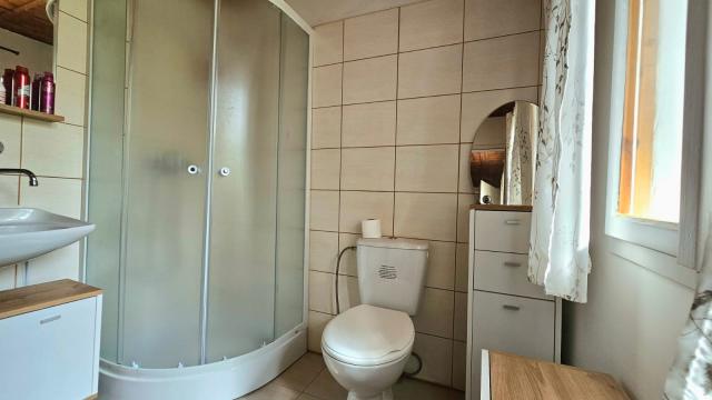 Prízemie chaty tvorí dennú časť a pozostáva z krásne presvetlenej vstupnej chodby, kuchyne so špajzou, útulnej obývacej miestnosti s krbom a kúpeľne so sprchovým boxom a toaletou.